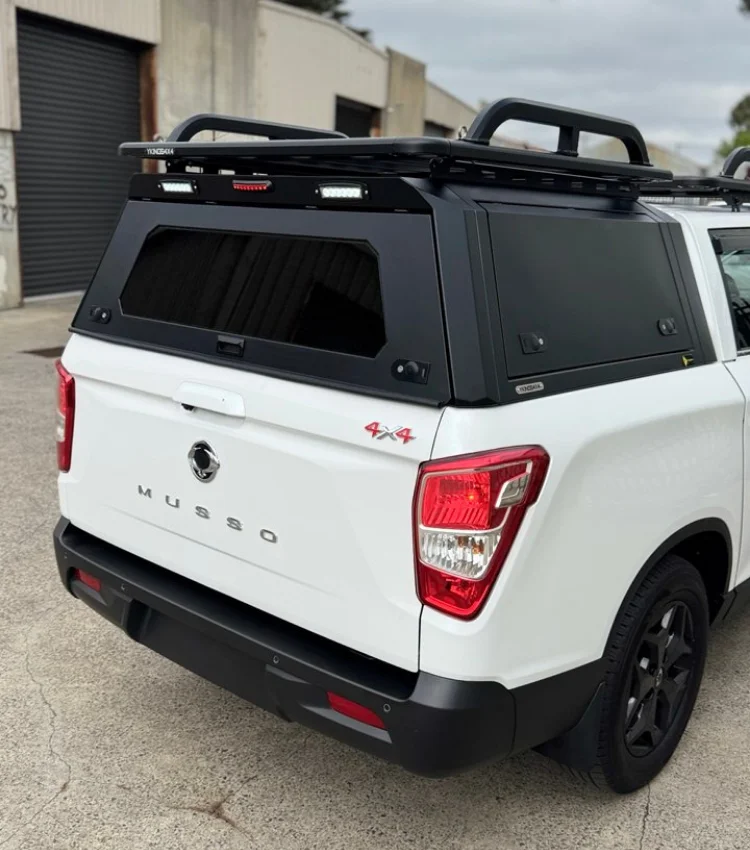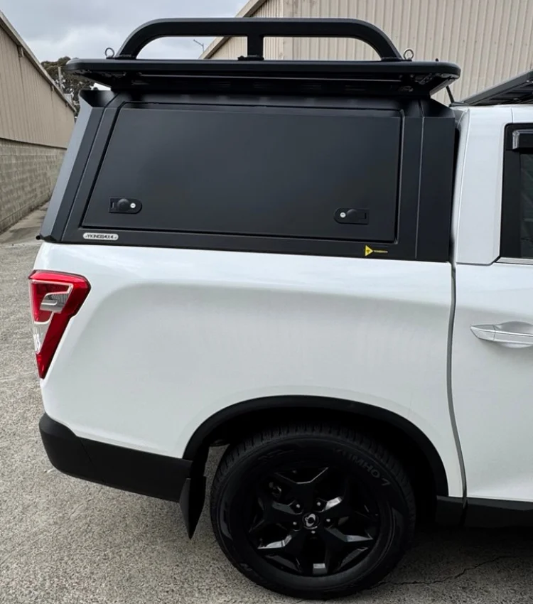 Designed using a 3D scan of the Ssangyong KGM Musso 2018 to current sort tub ( SWB) with practicality and durability in mind, this canopy is engineered to perform in harsh Australian conditions. It features solid powder-coated steel construction, three locking doors for convenient tub access, and a rear door with tempered glass that maintains rear-view visibility.